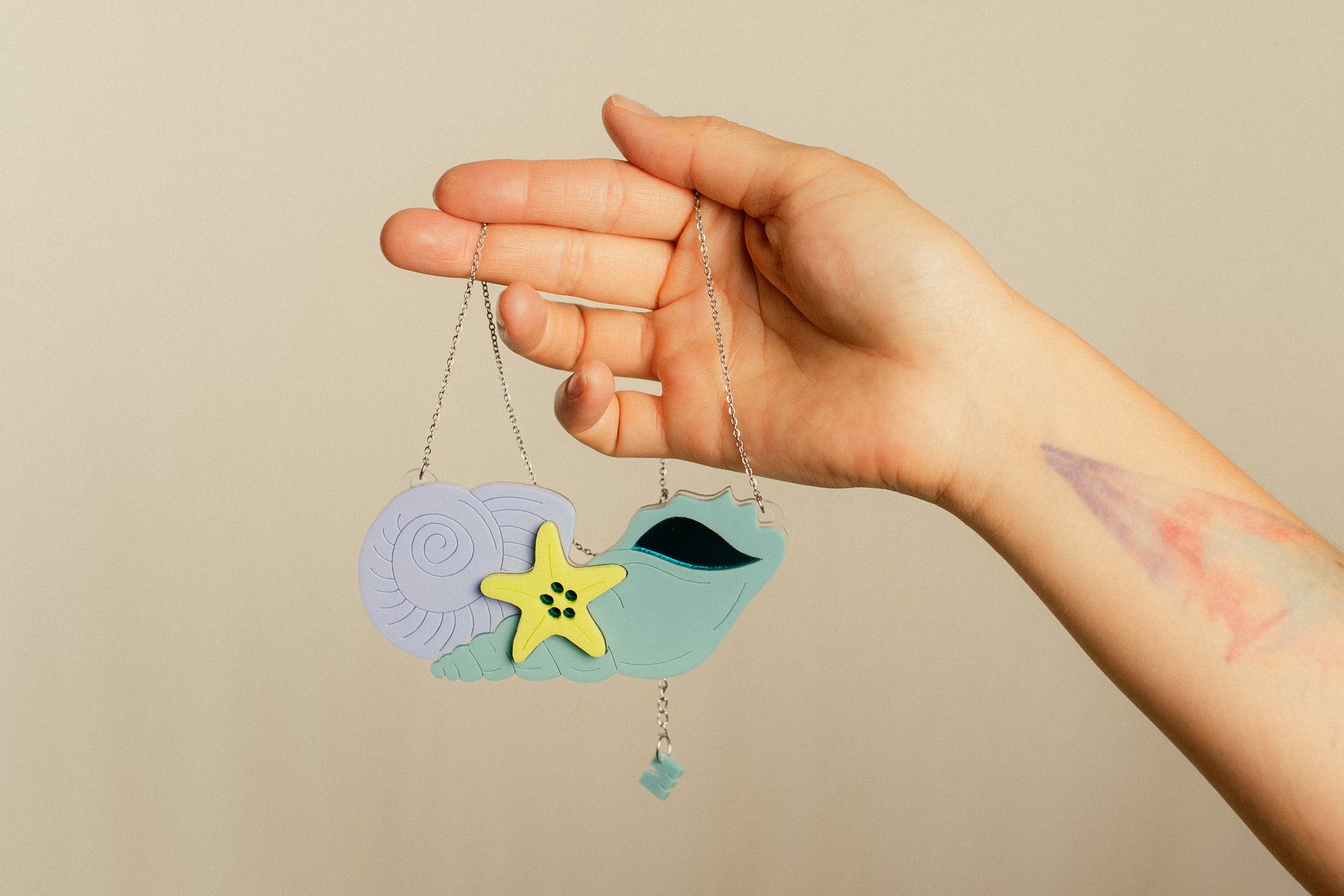 Este bello collar es parte de la colaboración Pahua x Marimba, donde Marimba reinterpretó las ilustraciones de Borogato para transformarlas en joyería.