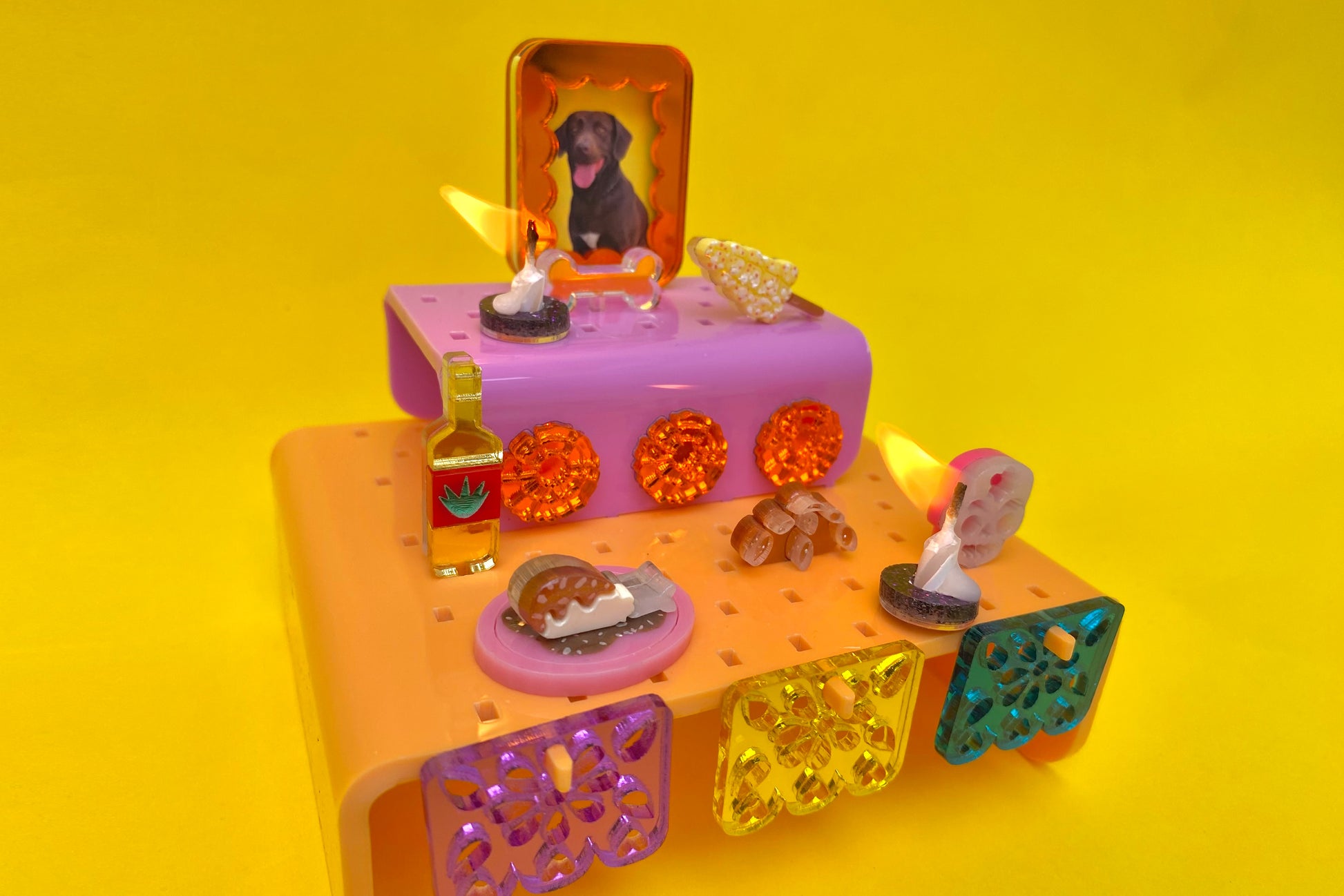 Es una pieza interactiva en la que podrás armar tu propia ofrenda a tu gusto: desde la colocación de los pisos, el acomodo de cada elemento, hasta incluir los objetos que más le habrían gustado a tu muertito. Incluso podrás imprimir, recortar y colocar su foto en el mini portarretratos.